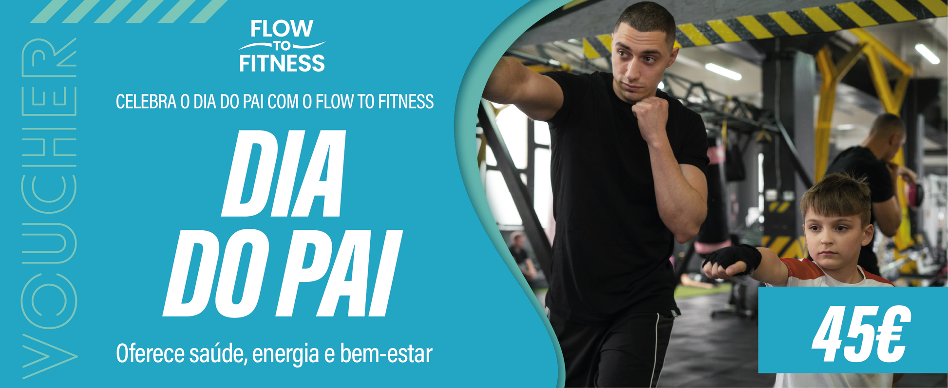 Este voucher inclui 45€ para um treino personalizado, pensado para ajudar o pai a cuidar do corpo e da saúde com acompanhamento profissional.